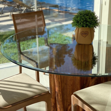 Der Rustic Glas Table verbindet die kraftvolle Präsenz eines massiven Guaranta‑Stammes mit der Leichtigkeit einer schwebenden Glasplatte. Der natürlich gewachsene Stamm bildet das Fundament – roh, warm und voller Charakter. Darüber liegt eine klare Glasfläche, die den Blick auf die organische Struktur des Holzes freigibt und dem Tisch eine fast schwerelose Eleganz verleiht.